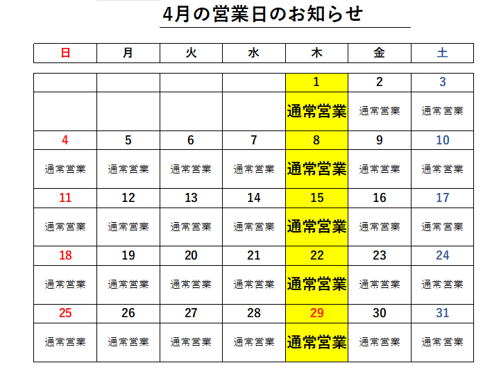 2026年4月の店休日は、こちら↓↓
