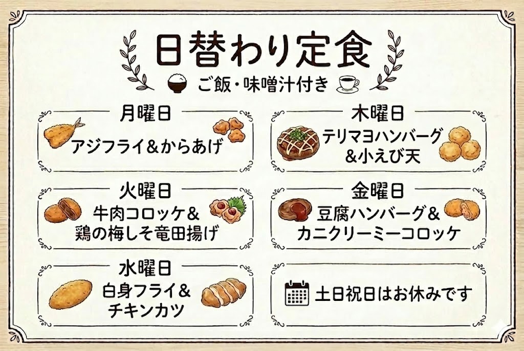 詳しくは、日替わり定食の復活のページをご確認ください。<(_ _)>