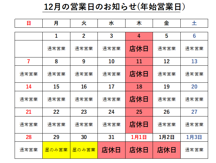 年末年始の店休日は、下記の表の様になります。