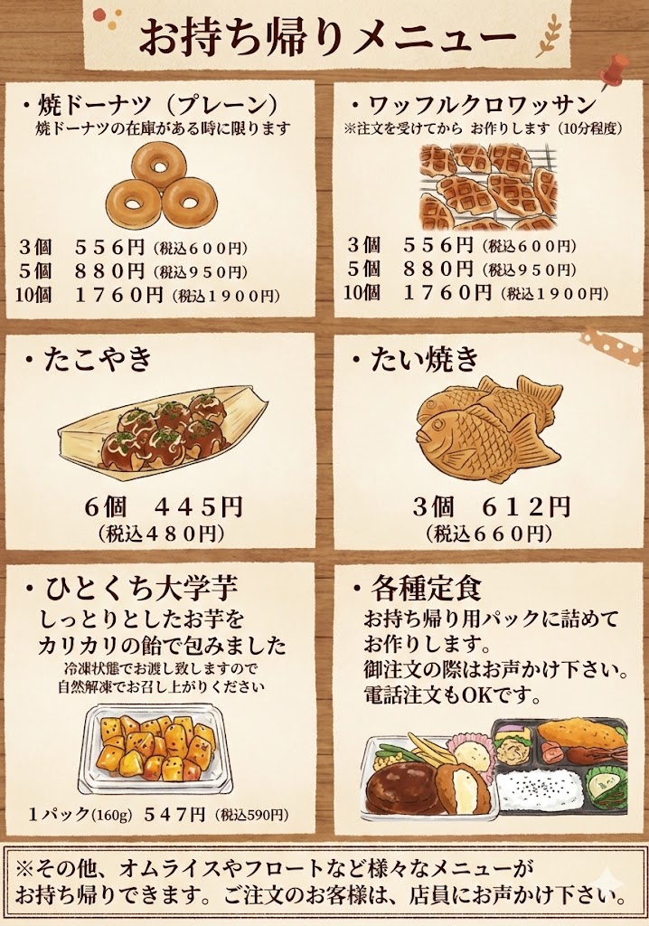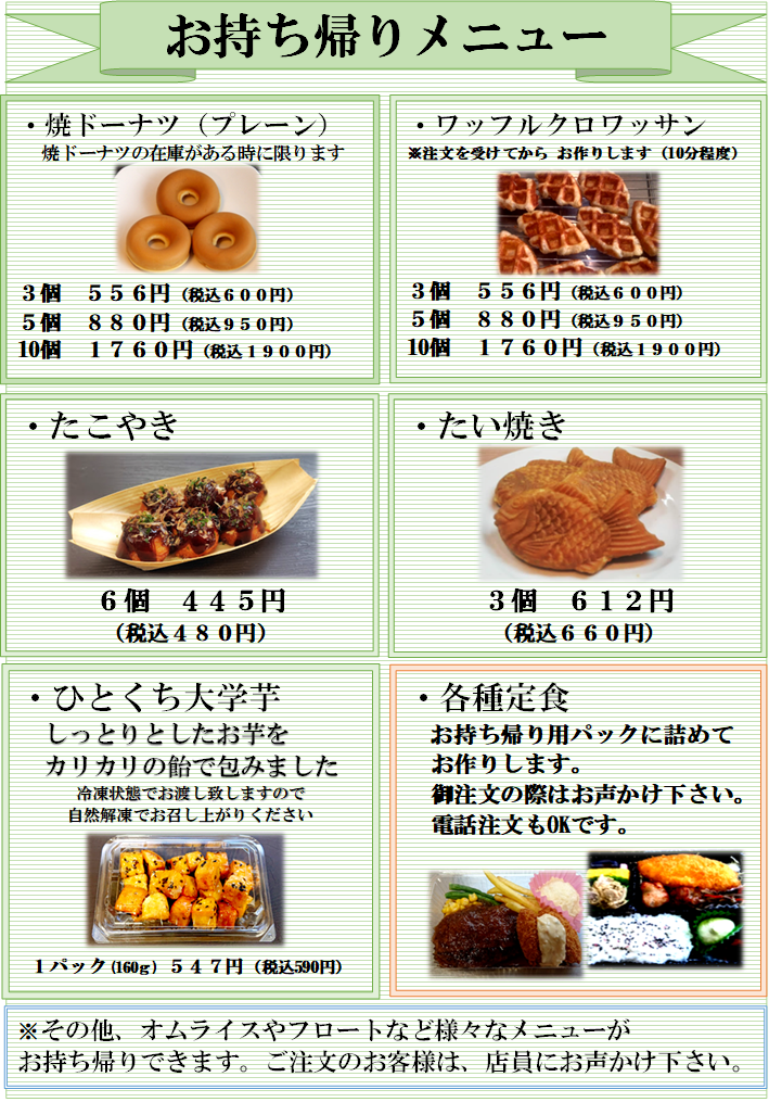 今回は、モバイルオーダーと自動精算機の導入が迫っておりますので、大変申し訳ございませんが、個々のメニューの細かな紹介は、省略させて頂きます。