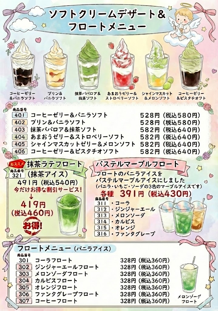 今回は、モバイルオーダーと自動精算機の導入が迫っておりますので、大変申し訳ございませんが、個々のメニューの細かな紹介は、省略させて頂きます。