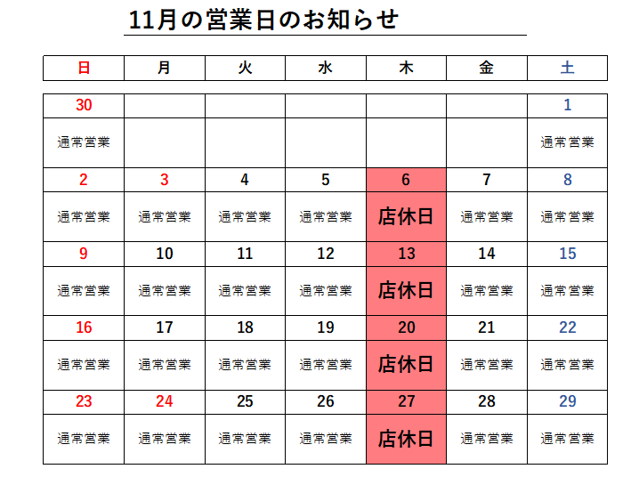 この他にもお店を休む場合がありますが、Xやインスタグラムやブログ等々のSNSと店頭ポスターにてお知らせ致しております。